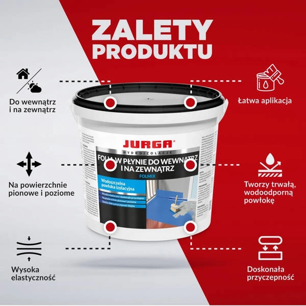 Folia w płynie do wewnątrz i zewnątrz 1 kg Folmix Jurga to innowacyjna, jednoskładnikowa hydroizolacja, która zapewnia skuteczną ochronę powierzchni przed wilgocią i wodą. Produkt jest gotowy do użycia i przeznaczony do stosowania zarówno w pomieszczeniach, jak i na zewnątrz – idealnie sprawdzi się w łazienkach, kuchniach, na balkonach czy tarasach. Tworzy elastyczną, szczelną powłokę, która mostkuje rysy i chroni przed działaniem czynników atmosferycznych, takich jak deszcz czy mróz. Dzięki ekologicznej formule bez rozpuszczalników Folmix jest bezpieczny dla użytkownika i środowiska. Doskonale przyczepia się do różnych podłoży budowlanych, gwarantując trwałą i efektywną hydroizolację.