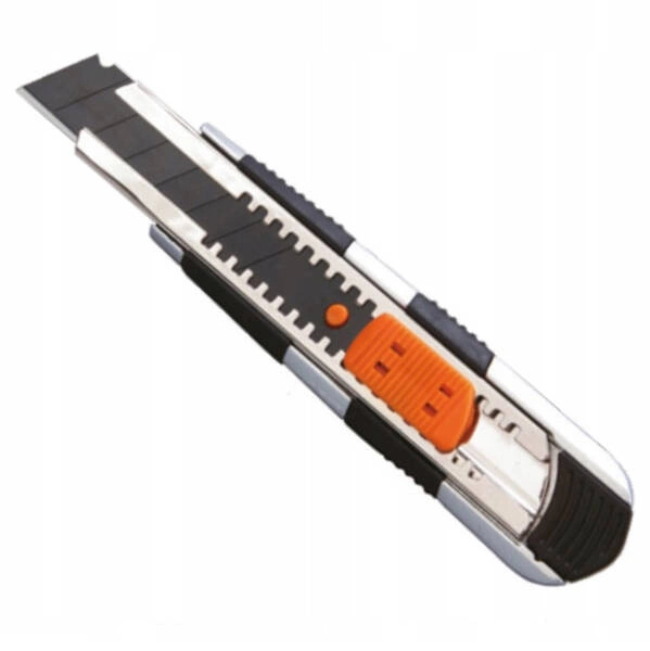 Nóż z ostrzem łamanym w rozmiarze 18mm. Rdzeń noża jest wykonany z metalu natomiast oprawa została ogumowana. Ostrza są niezwykle ostre. Wygodny w użyciu dzięki bardzo łagodnemu mechanizmowi do wysuwania. Doskonale sprawdza się podczas prac na budowach i podczas remontów, ale przydatny jest również w każdym gospodarstwie domowym.