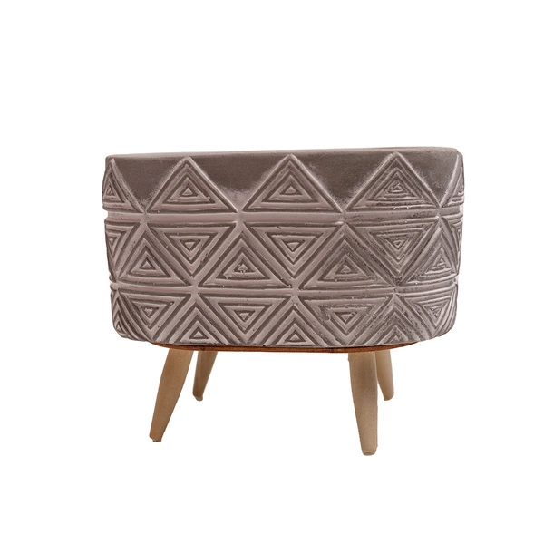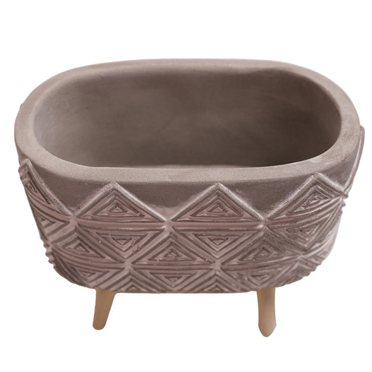 Osłonka w pięknie szarym kolorze, osadzona na nóżkach, z powierzchnią ozdobioną trójkątnym dekorem. Pozwoli wyeksponować uprawy w wyjątkowy sposób, tak aby stały się mocnym, charakterystycznym elementem dekoracyjnym wnętrza.