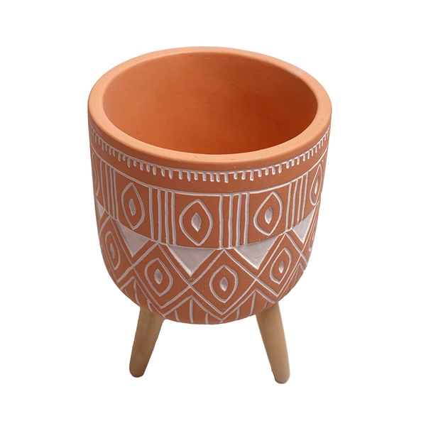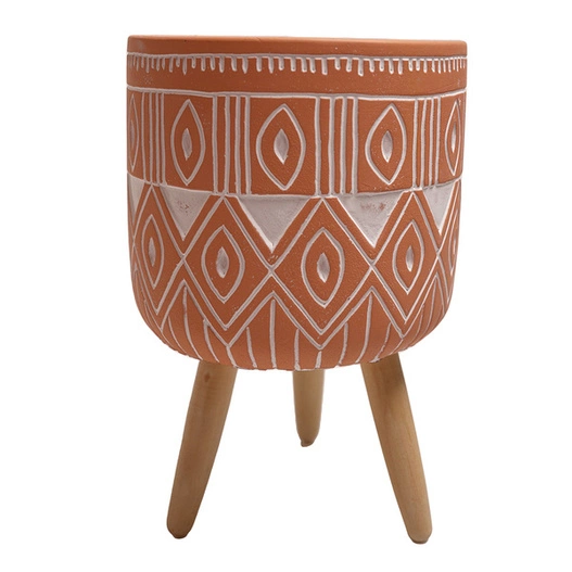 Osłonka w pięknie ceglastym kolorze, osadzona na nóżkach, z powierzchnią ozdobioną białym dekorem. Pozwoli wyeksponować uprawy w wyjątkowy sposób, tak aby stały się mocnym, charakterystycznym elementem dekoracyjnym wnętrza.