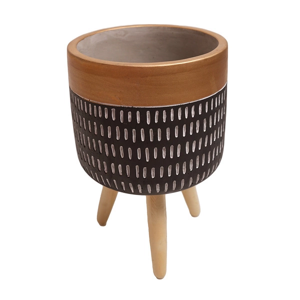 Osłonka w pięknie czarnym kolorze, ze złotymi rantami, osadzona na nóżkach i ozdobiona białymi cętkami. Pozwoli wyeksponować uprawy w wyjątkowy sposób, tak aby stały się mocnym, charakterystycznym elementem dekoracyjnym wnętrza.