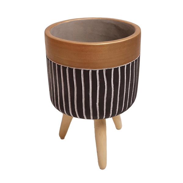 Osłonka w pięknie czarnym kolorze, ze złotymi rantami, osadzona na nóżkach i ozdobiona białymi paskami. Pozwoli wyeksponować uprawy w wyjątkowy sposób, tak aby stały się mocnym, charakterystycznym elementem dekoracyjnym wnętrza.