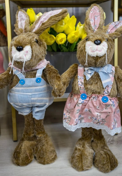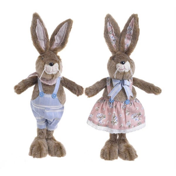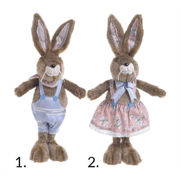 Figurka przedstawiająca zajączka w pięknych, niebieskich ogrodniczkach lub różowej sukience. Jest elementem dekoracyjnym, który wpływa na klimat wnętrza, zwłaszcza w okresie świąt Wielkanocy.