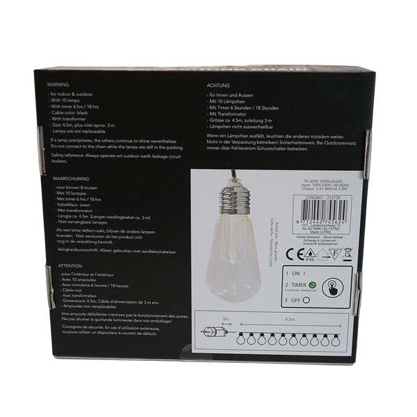 Atrakcyjna girlanda z diodami LED, która przeznaczona jest do użytku wewnątrz i na zewnątrz. Zastosowano w niej żarówki, które mieszczą w sobie diody LED. Zapewnia ciepłe, białe światło, które tworzy przyjemną, miłą atmosferze w ogrodowej przestrzeni. Pozwala na ciekawą aranżację, która jeszcze mocniej zadba o relaks. Jest też świetną formą doświetlenia altany, tarasu, balkonu, stanowi przyjemne tło podczas grilla i innych spotkań w plenerze.