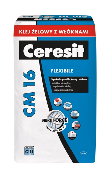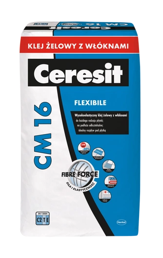Zaprawa Ceresit CM 16 służy do mocowania płytek ceramicznych (glazura, terakota, gres), cementowych i kamiennych (oprócz marmuru) na podłożach odkształcalnych. CM 16 polecana jest do mocowania płytek na wiotkich ściankach działowych, ogrzewanych podłogach, elewacjach, tarasach i balkonach. Wysoka przyczepność zaprawy sprawia, że zalecana jest ona do płytek o nasiąkliwości < 3%, np. gresowych oraz do mocowania płytek na podłożach krytycznych (tylko wewnątrz budynków): istniejących płytkach, mocnych i dobrze przyczepnych powłokach malarskich, podłożach gipsowych, anhydrytowych, betonie komórkowym. Płytki z marmuru i innych skał grubokrystalicznych należy mocować zaprawą Ceresit CM 15.