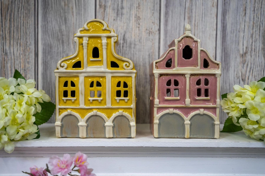 - Domek Holenderski na T-light ceramika żółty trzy bramy lampion świecznik 20,5 cm