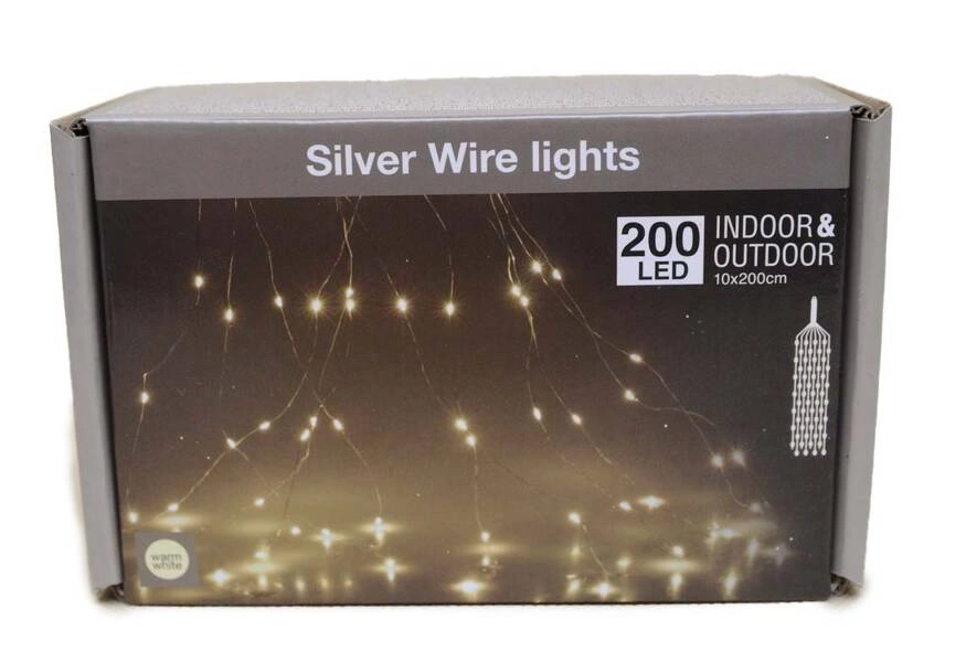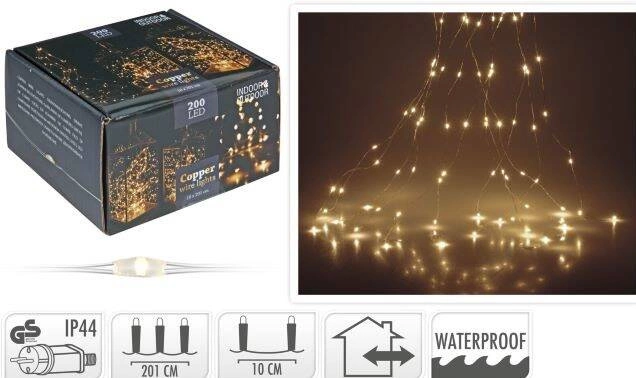 Oświetlenie świąteczne do stosowania wewnątrz i zewnątrz, składające się z 200 ledowych lampek. Lampki świecą białym ciepłym światłem. Stanowią bardzo atrakcyjną dekorację, która nada magii w czasie świąt Bożego Narodzenia.