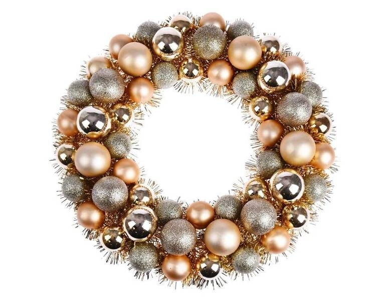 Dekoracja wykonana w formie wianka składającego się z 56 bombek w kolorze szampańsko-srebrnym. Wianek może być eksponowany na drzwiach, w oknie czy na stole.