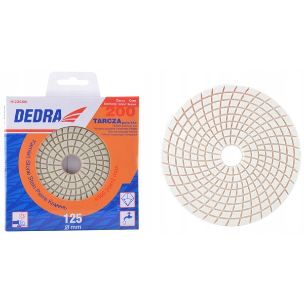 Dysk polerski diamentowy GR: 200 / 125mm Dedra idealnie sprawdzi się podczas szlifowania i polerowania blatów kuchennych, schodów, parapetów, elementów dekoracyjnych z kamienia naturalnego i sztucznego, a także przy renowacji powierzchni z twardych materiałów budowlanych.