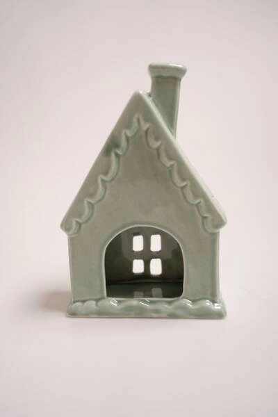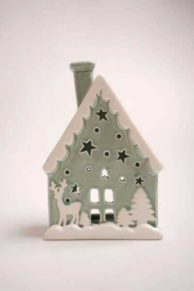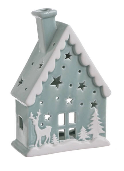 Domek ceramiczny T-light miętowy biały renifer i choinki 20cm