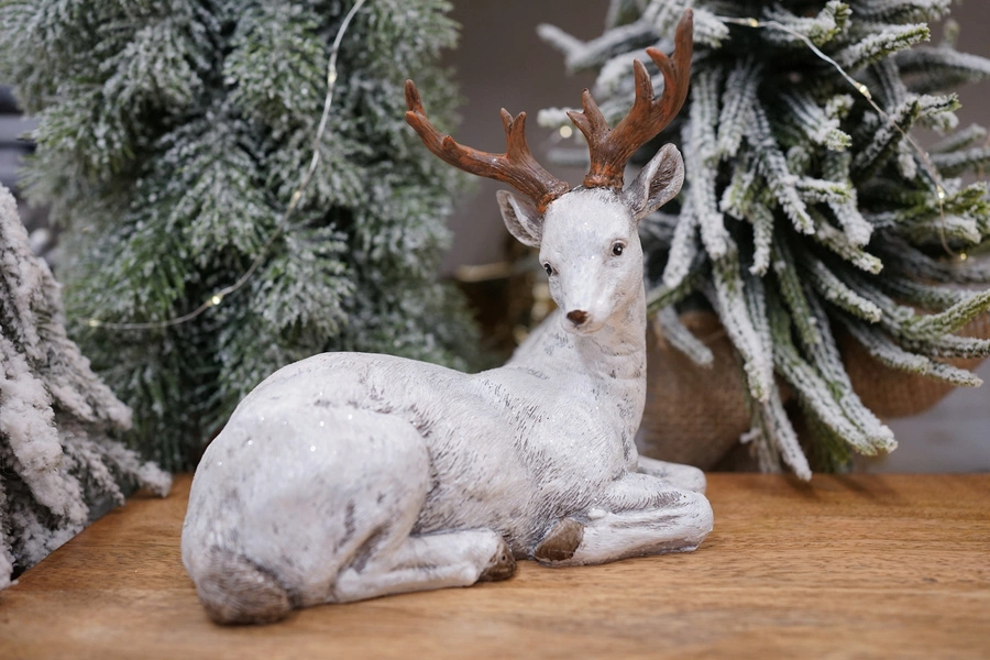 Figurka Jeleń leżący biały szczotkowany brązowe rogi doskonale sprawdzi się jako dekoracja świąteczna do salonu, jadalni, przedpokoju czy biura. Może być elementem aranżacji stołu wigilijnego, ozdobą komody, parapetu lub półki, a także eleganckim akcentem w witrynie sklepowej czy hotelowym lobby.