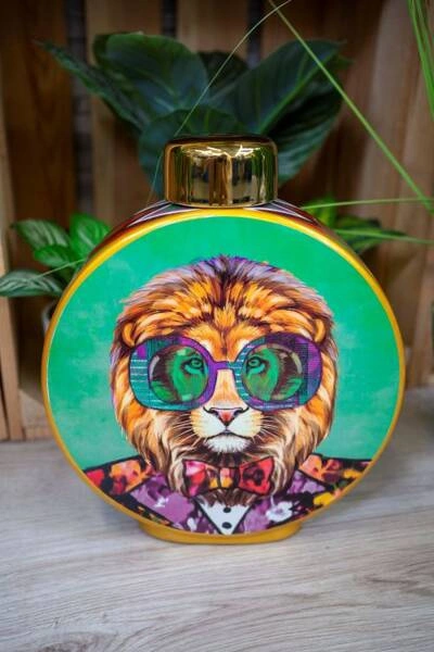 Nowoczesny i oryginalny wazon z namalowanym lwem w zielonych okularach, stanowi niebywałą inspirację do tworzenia cudownych dekoracji oraz kompozycji kwiatowych.