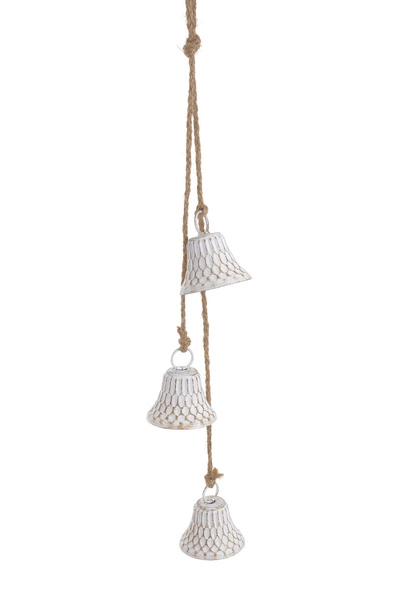 - Dzwonki metalowe białe przycierane 3 sztuki na jutowym sznurze 57 cm
