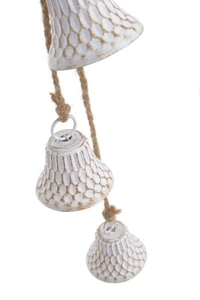 Metalowe dzwonki białe przycierane 3 sztuki na jutowym sznurze, pozwalająca stworzyć we wnętrzu prawdziwie magiczną atmosferę świąt Bożego Narodzenia.