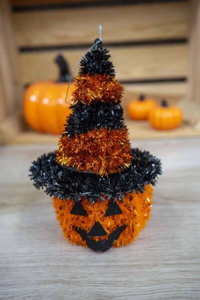 Figurka przygotowana w czarno-pomarańczowym kolorze. Przedstawia dynię w czarno-pomarańczowym kapeluszu. Ozdoba buduje i podkreśla klimat wesołego Halloween, stając się bazą budującą nastrój wnętrza.