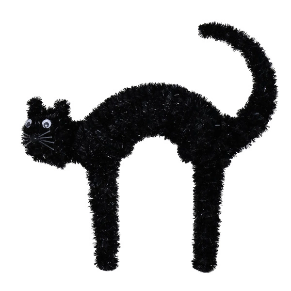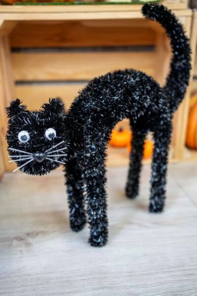 Figurka przygotowana w czarnym kolorze, przedstawiająca nastroszonego, włochatego kota. Ozdoba buduje i podkreśla klimat wesołego Halloween, stając się bazą budującą nastrój wnętrza.