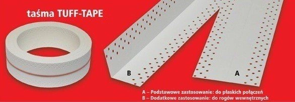 - Taśmę TUFF-TAPE stosuje się do łączeń płyt gipsowo-kartonowych na płaskich powierzchniach (takich jak sufit czy ściany) w miejsce siatki, fizeliny, taśmy papierowej, taśmy papierowej z wkładką aluminiową, oraz do wykańczania narożników wewnętrznych.