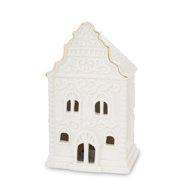 Ceramiczny biały domek LED ze złotymi rantami. To uniwersalna dekoracja. Będzie pasowała do wielu zaplanowanych świątecznych i zimowych aranżacji.