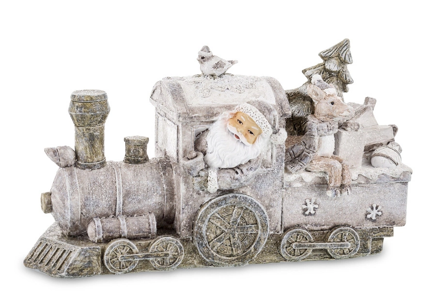Oryginalna i stylowa dekoracja, przedstawiająca Mikołaja w szarym pociągu. Z wielką siłą przywołuje magię świąt Bożego Narodzenia, tworząc piękny i niepowtarzalny klimat. Dekoracja wyposażona została w oświetlenie LED.