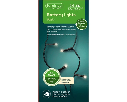 Oświetlenie świąteczne do stosowania zarówno na zewnątrz jak i wewnątrz, składające się z 24 ledowych lampek umieszczonych na czarnym przewodzie. Lampki świecą ciepłym białym światłem. Stanowią bardzo atrakcyjną dekorację, która nada magii w czasie świąt Bożego Narodzenia. Lampki posiadają 8 trybów świecenia.