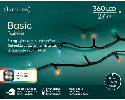 Oświetlenie świąteczne do stosowania na zewnątrz, składające się z 360 ledowych lampek umieszczonych na czarnym przewodzie. Lampki świecą wielokolorowym światłem. Stanowią bardzo atrakcyjną dekorację, która nada magii w czasie świąt Bożego Narodzenia.