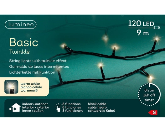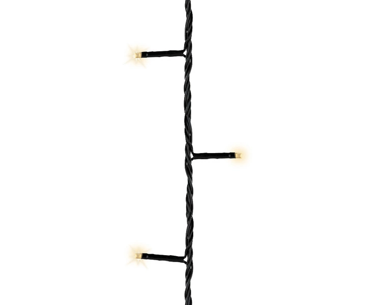 Oświetlenie świąteczne do stosowania na zewnątrz, składające się z 120 ledowych lampek umieszczonych na czarnym przewodzie. Lampki świecą białym ciepłym światłem. Stanowią bardzo atrakcyjną dekorację, która nada magii w czasie świąt Bożego Narodzenia.
