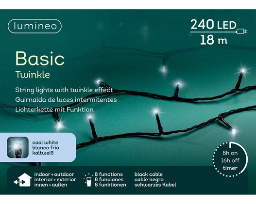 Oświetlenie świąteczne do stosowania na zewnątrz, składające się z 240 ledowych lampek umieszczonych na czarnym przewodzie. Lampki świecą białym zimnym światłem. Stanowią bardzo atrakcyjną dekorację, która nada magii w czasie świąt Bożego Narodzenia.