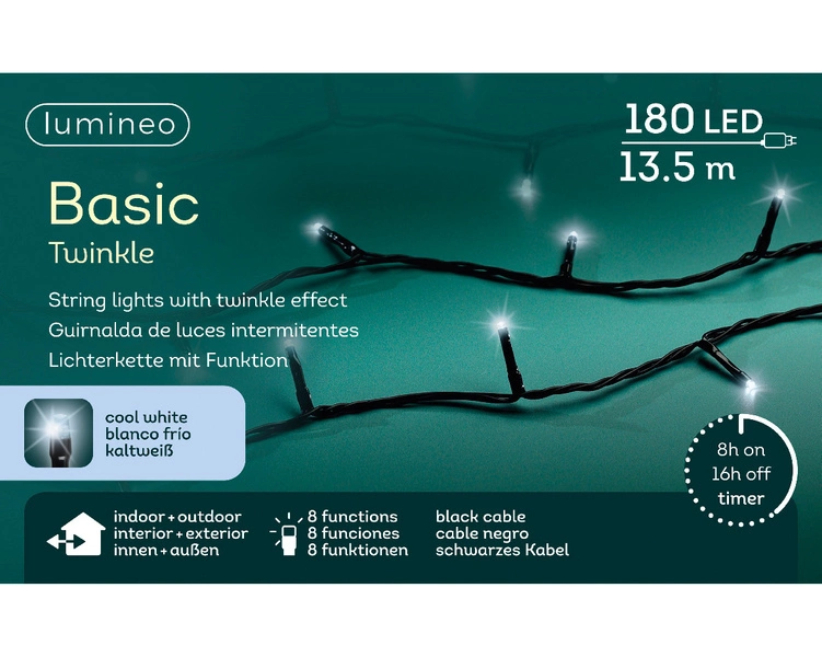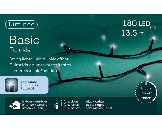 Oświetlenie świąteczne do stosowania na zewnątrz, składające się z 180 ledowych lampek umieszczonych na czarnym przewodzie. Lampki świecą białym zimnym światłem. Stanowią bardzo atrakcyjną dekorację, która nada magii w czasie świąt Bożego Narodzenia.