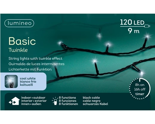 Oświetlenie świąteczne do stosowania na zewnątrz, składające się z 120 ledowych lampek umieszczonych na czarnym przewodzie. Lampki świecą białym zimnym światłem. Stanowią bardzo atrakcyjną dekorację, która nada magii w czasie świąt Bożego Narodzenia.
