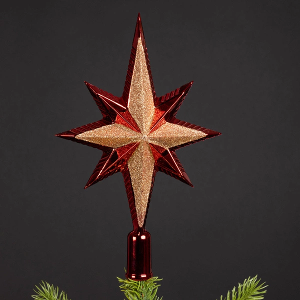 Czub gwiazda na choinkę w intensywnym, czerwonym kolorze to klasyczna dekoracja świąteczna, która zachwyca subtelnym brokatowym połyskiem. Wykonana w tradycyjnym kształcie gwiazdy, pięknie odbija światło lampek, dodając choince wyjątkowej elegancji i przytulności. To ozdoba, która przywołuje wspomnienia rodzinnych Świąt i buduje magiczny klimat w Twoim domu.