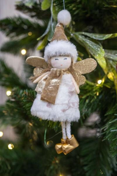 Zawieszka na choinkę przedstawiająca aniołka w futerku biało-złotym. Stanowi atrakcyjną formę dekoracji bożonarodzeniowej, podkreślającą klimat i nastrój Świąt.