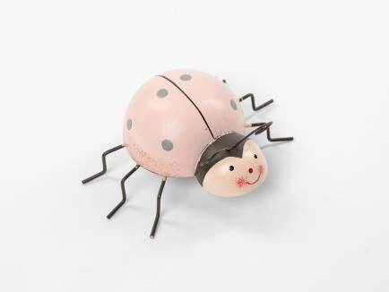 Figurka przedstawia metalową biedronkę w kolorze pudrowego różu.