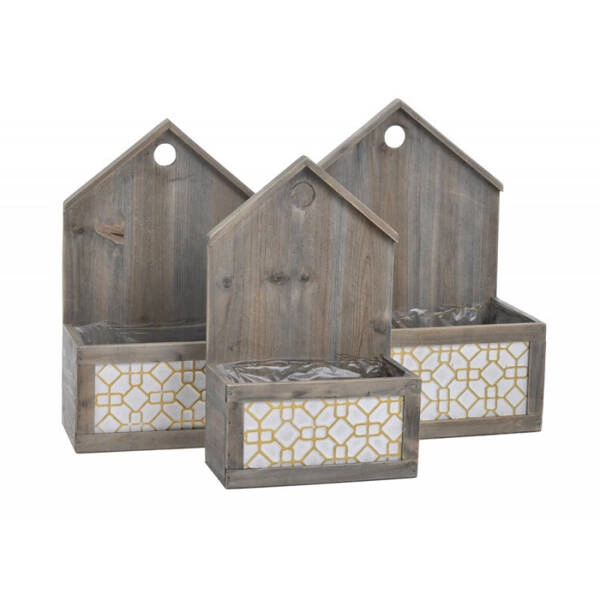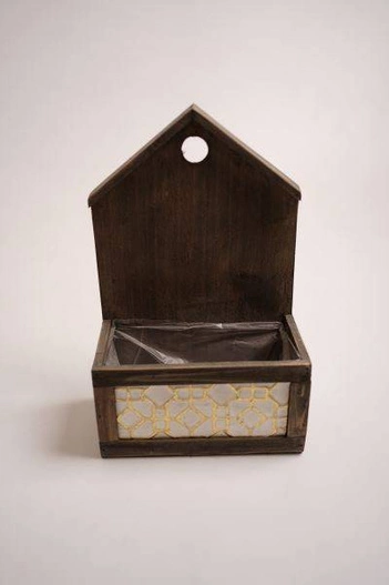 Osłonka skrzynka z uchwytami drewnianymi w kształcie domku. Tworzy wspaniałą dekorację i doskonałą podstawę dla upraw. Pozwala na atrakcyjną ekspozycję roślin, budując dekorację wnętrza, która znacząco wpływa na jego klimat.