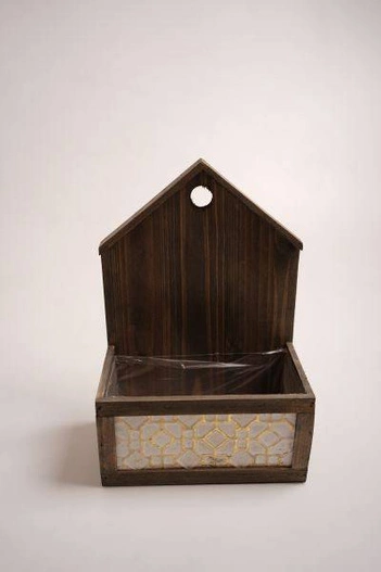 Osłonka skrzynka z uchwytami drewnianymi w kształcie domku. Tworzy wspaniałą dekorację i doskonałą podstawę dla upraw. Pozwala na atrakcyjną ekspozycję roślin, budując dekorację wnętrza, która znacząco wpływa na jego klimat.
