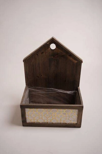 Osłonka skrzynka z uchwytami drewnianymi w kształcie domku. Tworzy wspaniałą dekorację i doskonałą podstawę dla upraw. Pozwala na atrakcyjną ekspozycję roślin, budując dekorację wnętrza, która znacząco wpływa na jego klimat.
