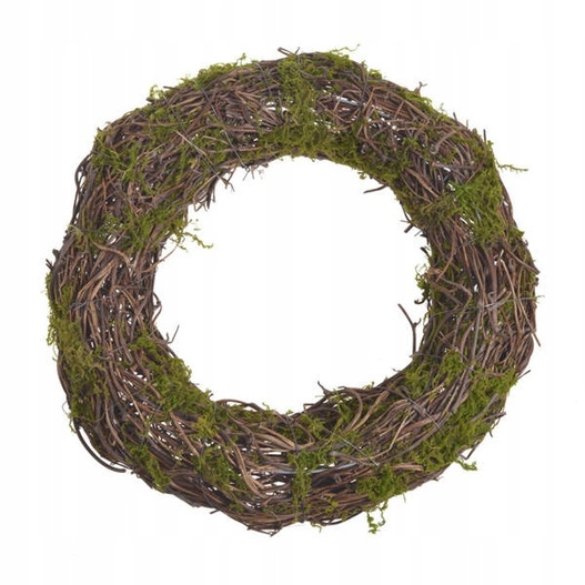 Bardzo ładny wianek na drzwi wykonany z drobnych patyków i pokryty sztucznym mchem. Doskonała dekoracja wnętrza, która wprowadzi ożywczą energię do każdego pomieszczenia.