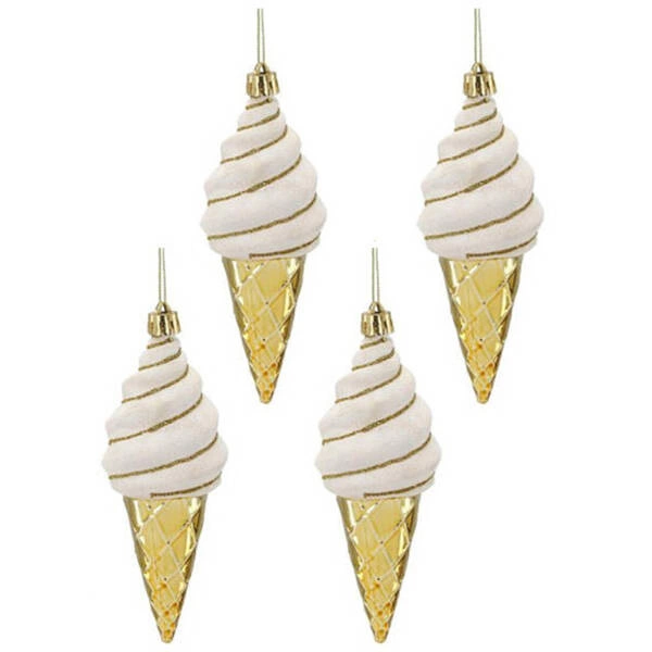 Bombki lody 4szt 13cm Złote świetnie sprawdzą się jako ozdoba choinki, ale równie pięknie prezentują się na stroikach, girlandach czy w dekoracyjnych kompozycjach na stole. Dodadzą uroku dziecięcemu pokoikowi, rozświetlą okno lub stworzą niepowtarzalną atmosferę podczas rodzinnych świąt. Możesz je także wykorzystać jako oryginalny dodatek do prezentu, by sprawić bliskim jeszcze więcej radości.