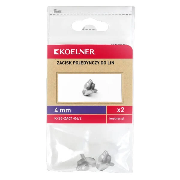 Zacisk siodełkowy pojedynczy do lin 4mm marki Koelner to niezawodne rozwiązanie do łączenia oraz zaciskania lin stalowych i włókien sztucznych. Solidna konstrukcja, precyzyjne wykonanie oraz powłoka ocynkowana zapewniają trwałość i odporność na korozję. Zacisk składa się z korpusu z dwoma śrubami, blaszki i nakrętek, co gwarantuje mocne i bezpieczne połączenie dwóch odcinków liny. Idealny do prac montażowych, zabezpieczających i konstrukcyjnych, gdzie liczy się bezpieczeństwo oraz prostota użytkowania.