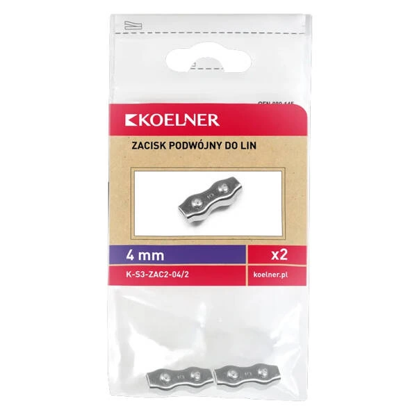 Zacisk siodełkowy podwójny do lin 4mm marki Koelner to niezawodne rozwiązanie do mocowania, łączenia i zabezpieczania lin stalowych oraz syntetycznych. W zestawie znajdują się dwa zaciski, które dzięki solidnej konstrukcji zapewniają stabilność i bezpieczeństwo połączeń. Produkt został zaprojektowany z myślą o łatwym i szybkim montażu, a jego uniwersalne zastosowanie sprawia, że sprawdzi się zarówno w pracach budowlanych, jak i podczas podwieszania czy zabezpieczania ładunków. Zacisk składa się z trzech elementów: korpusu z śrubami, blaszki oraz nakrętek, które gwarantują mocne i trwałe połączenie dwóch odcinków liny podczas dokręcania. To praktyczne i trwałe akcesorium, które zapewnia bezpieczeństwo użytkowania w każdych warunkach.