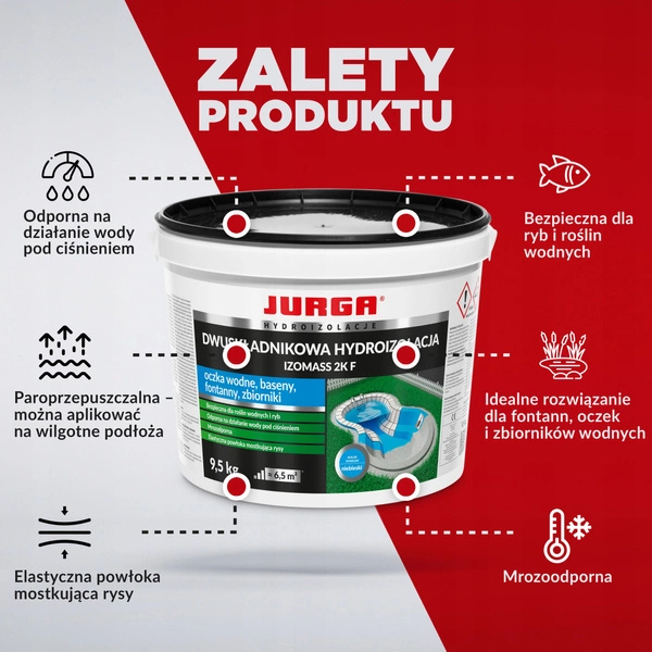 Dwuskładnikowa zaprawa hydroizolacyjna Jurga IZOMASS 2K F 9,5 kg to zaawansowany system uszczelniający, który gwarantuje niezawodną ochronę przed wodą pod ciśnieniem. Produkt po zmieszaniu dwóch składników tworzy elastyczną i wytrzymałą powłokę, idealną do stosowania w oczkach wodnych, fontannach, basenach oraz innych zbiornikach wodnych. Dzięki zastosowaniu nowoczesnych żywic syntetycznych, zaprawa doskonale przylega do różnych podłoży, zapewniając trwałe i szczelne zabezpieczenie nawet w trudnych warunkach. IZOMASS 2K F wyróżnia się odpornością na działanie chloru, niskich temperatur oraz paroprzepuszczalnością, co pozwala na aplikację na wilgotne powierzchnie. Produkt został opracowany i wyprodukowany w Polsce, z myślą o profesjonalnych i wymagających zastosowaniach budowlanych.
