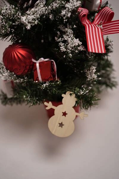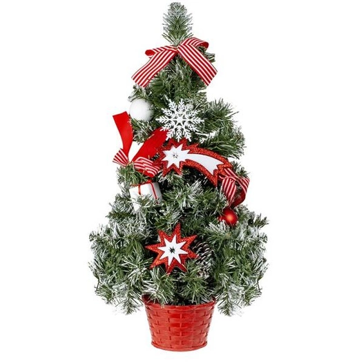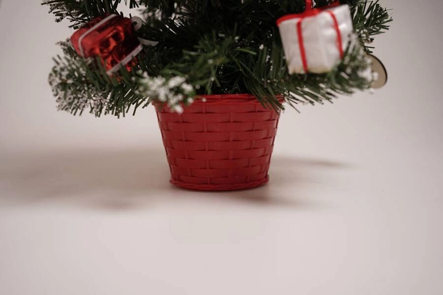 Sztuczna mała choinka, która wnosi do wnętrza wspaniały klimat świąt Bożego Narodzenia. Umieszczona została w plastikowej doniczce. Utrzymana w czerwonej kolorystyce.
