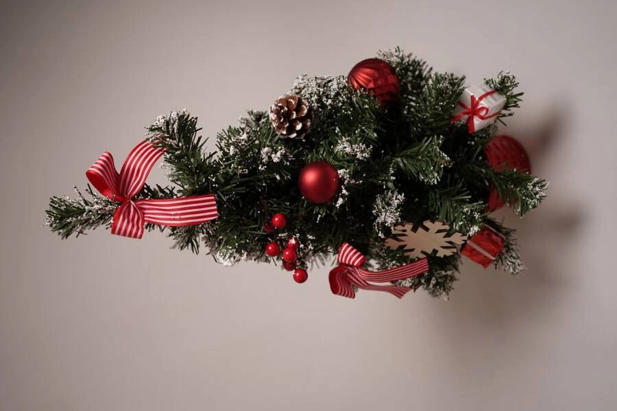Choinka dekorowana w czerwonej doniczce czerwone kokardy śnieżona