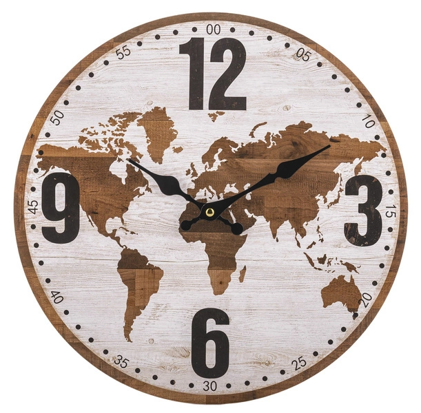 Zegar ścienny o okrągłym kształcie. Przedstawiający mapę świata