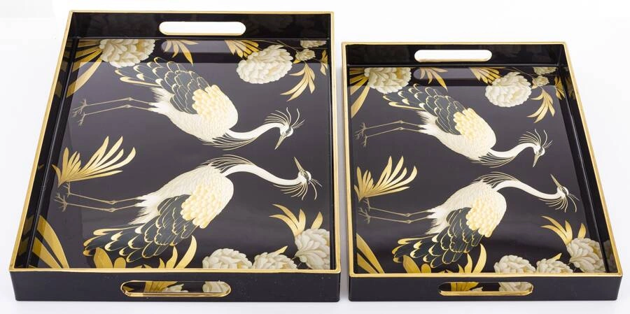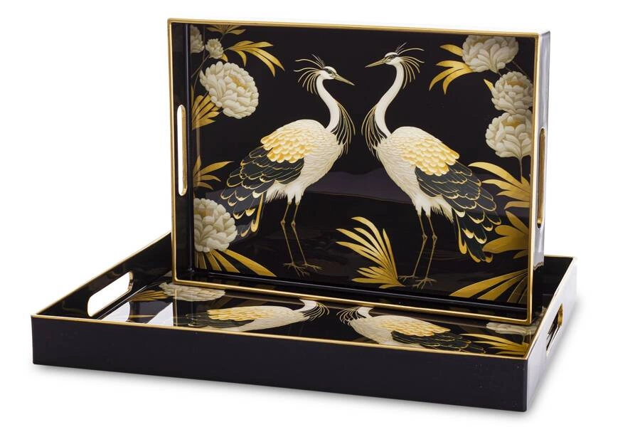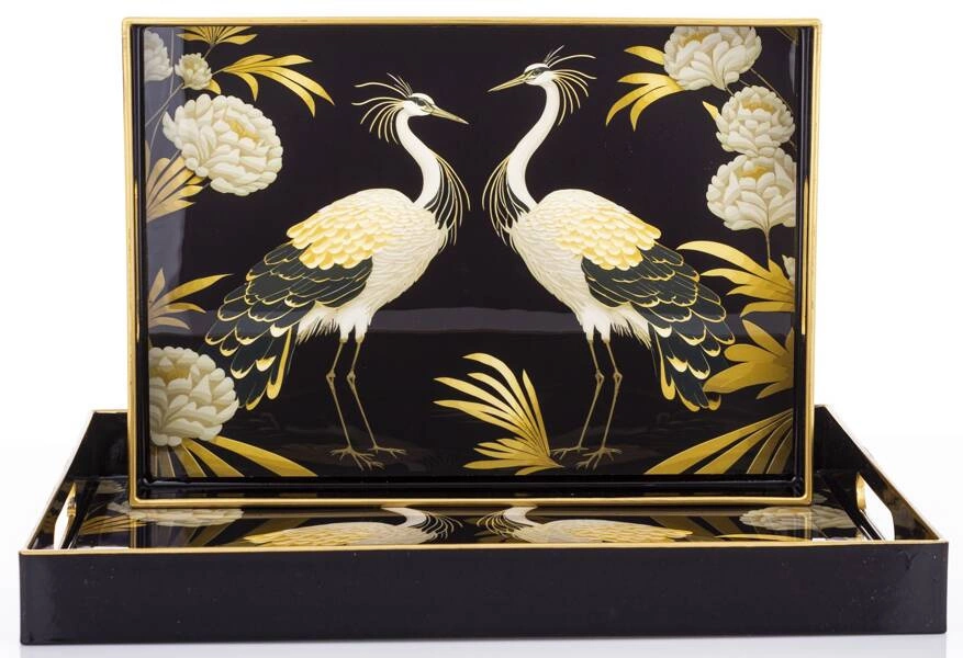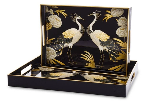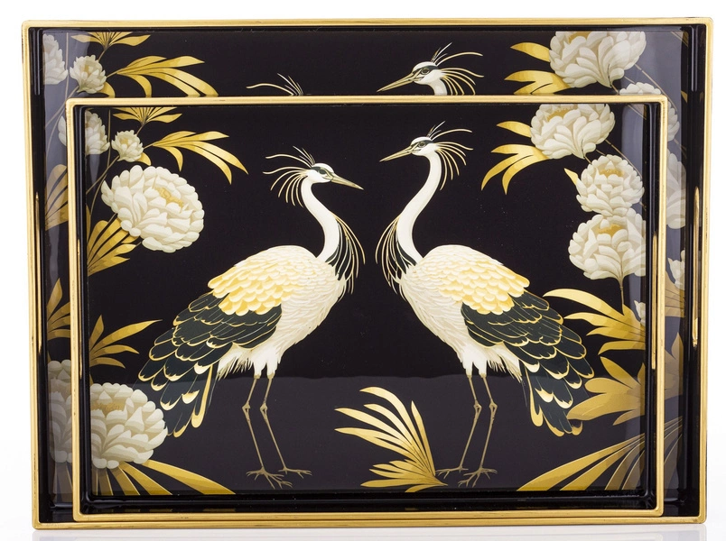 Taca dekoracyjna w kształcie prostokąta - doskonała ozdoba kuchni, salonu czy jadalni. Może służyć np. do ekspozycji owoców lub stroika. Posiada uchwyty na powierzchni i ozdobiona została wzorem pawi w kolorach czerni, bieli i złota.