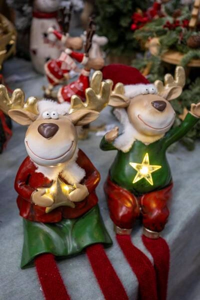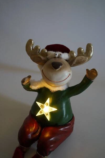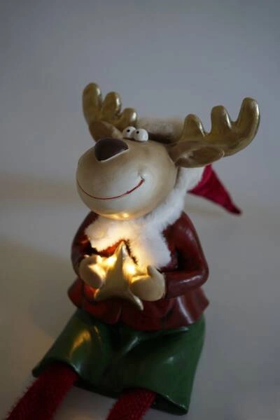 Sympatyczna figurka przedstawiająca renifera ze zwisającymi nogami. Na brzuchu umiejscowiono gwiazdkę LED. Stanowi atrakcyjną formę dekoracji bożonarodzeniowej, podkreślającą klimat i nastrój Świąt.