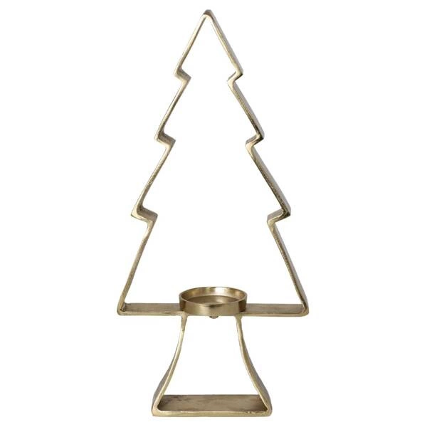 Świecznik metalowy w kształcie choinki na podstawce. Przygotowany w kolorze złota, staje się eleganckim dodatkiem, który uzupełnia charakter wnętrza.