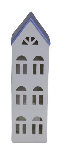 Domek ceramiczny biały na t-light niebieski dach 3 piętrowy lampion świecznik 30cm