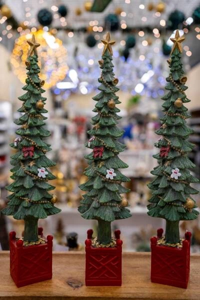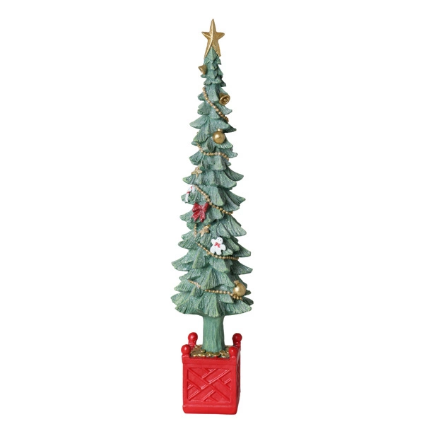 Bardzo ładna figurka przedstawiająca zieloną choinkę w czerwonej skrzynce. Stanowi intrygującą, stylową dekorację wnętrza, która w okresie Bożego Narodzenia nabiera dodatkowego charakteru.