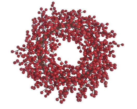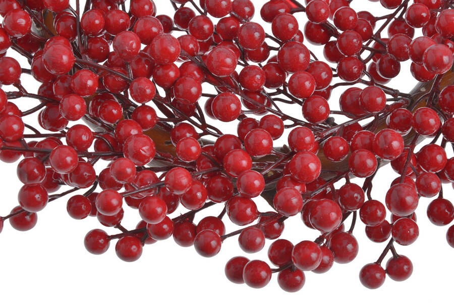 Sztuczna dekoracja wykonana w formie wianka z czerwonymi owocami. Piękny pomysł na udekorowanie domu, zwłaszcza w okresie zimy i Świąt Bożego Narodzenia.