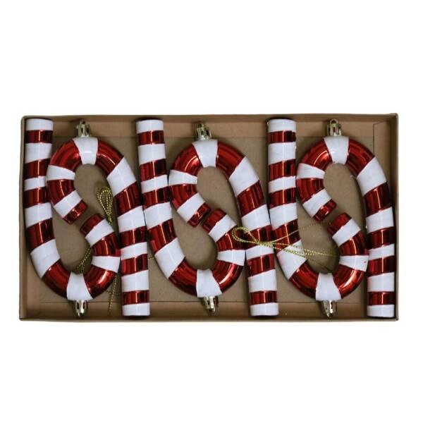 Bombki choinkowe przygotowane w kształcie cukrowych lasek, w kolorze czerwono-białym. Stanowią bardzo atrakcyjną formę dekoracji bożonarodzeniowego drzewka, podkreślającą klimat i nastrój świąt. Wprowadzają do wnętrza ciepłą atmosferę i cieszą oko.